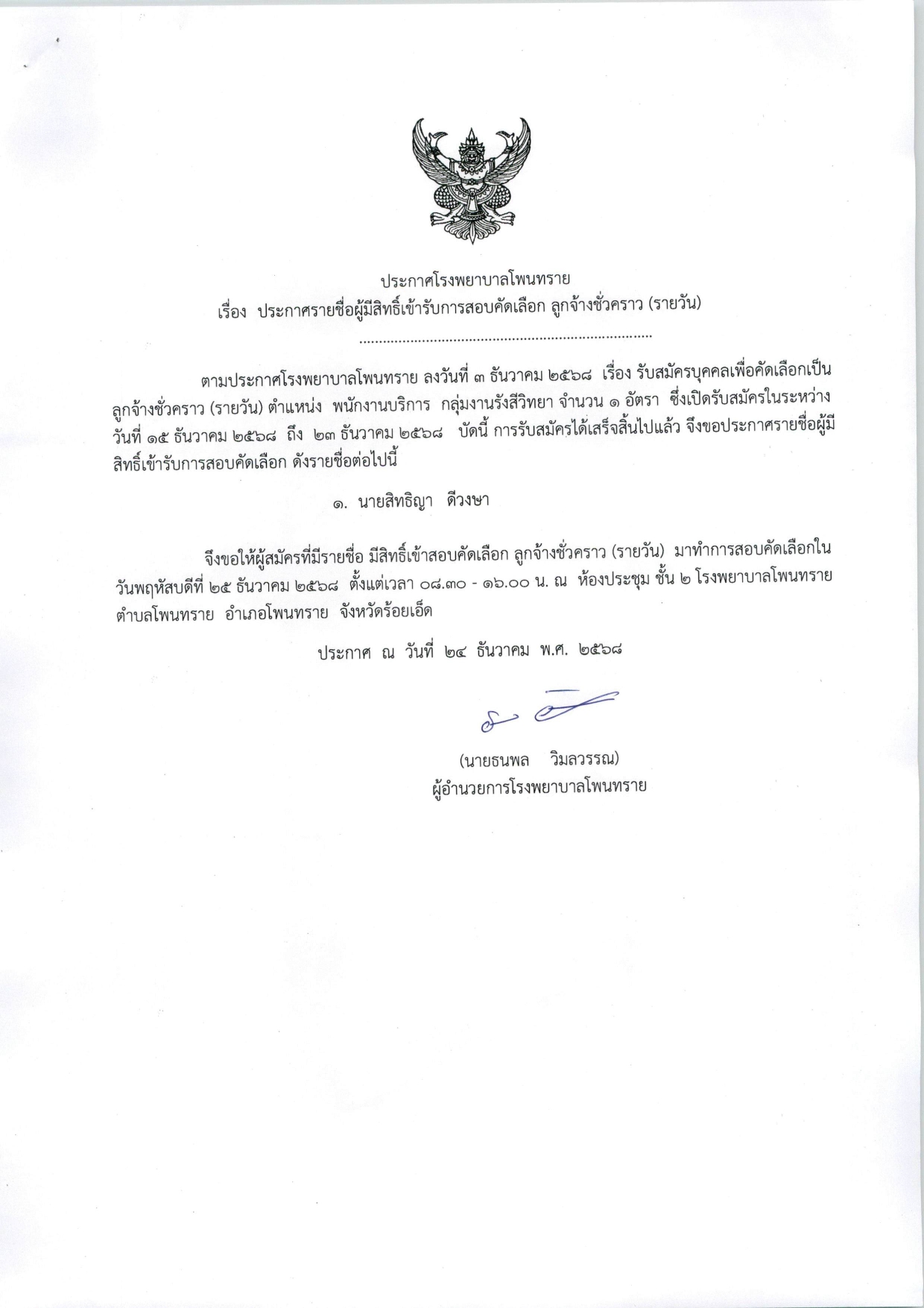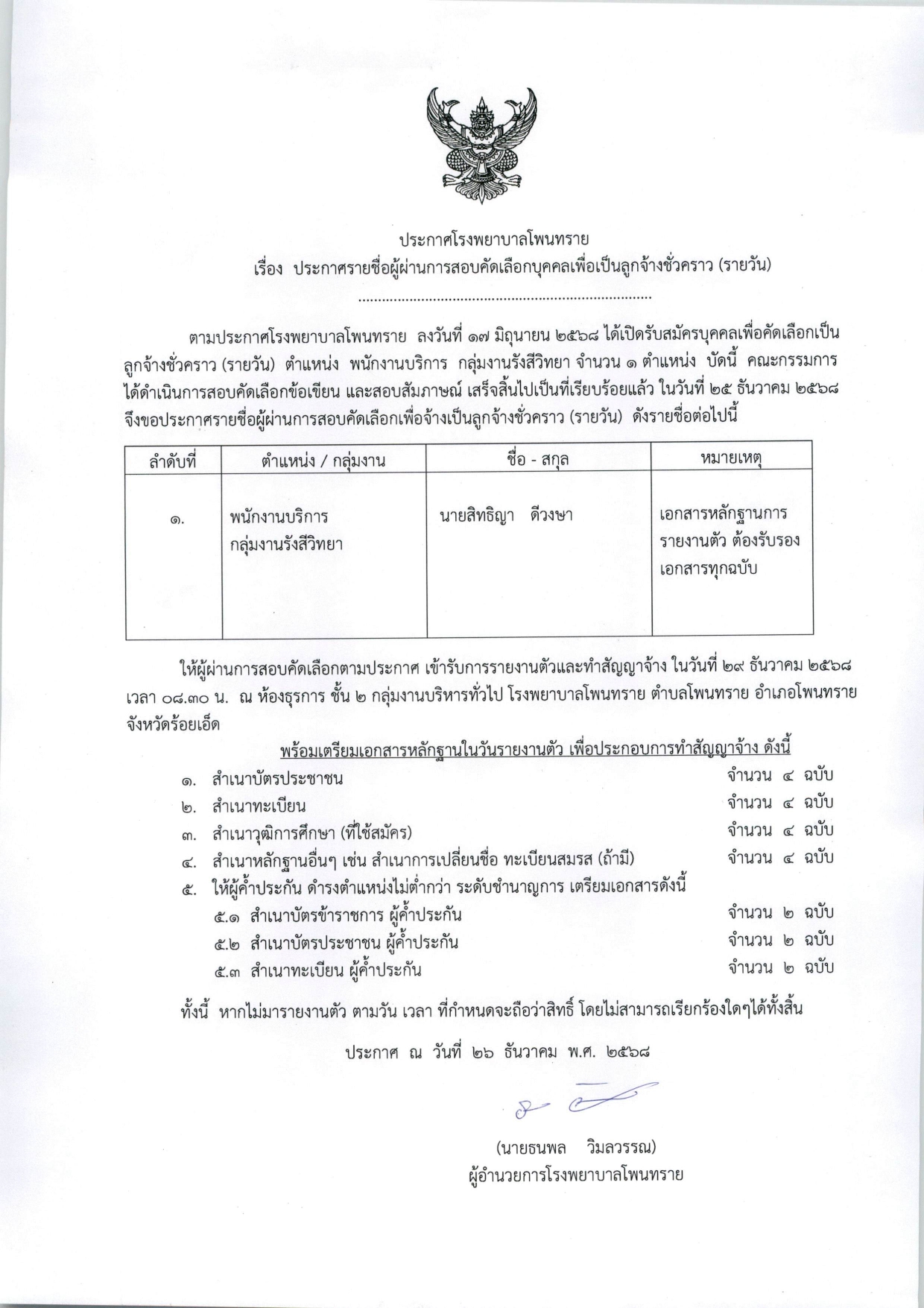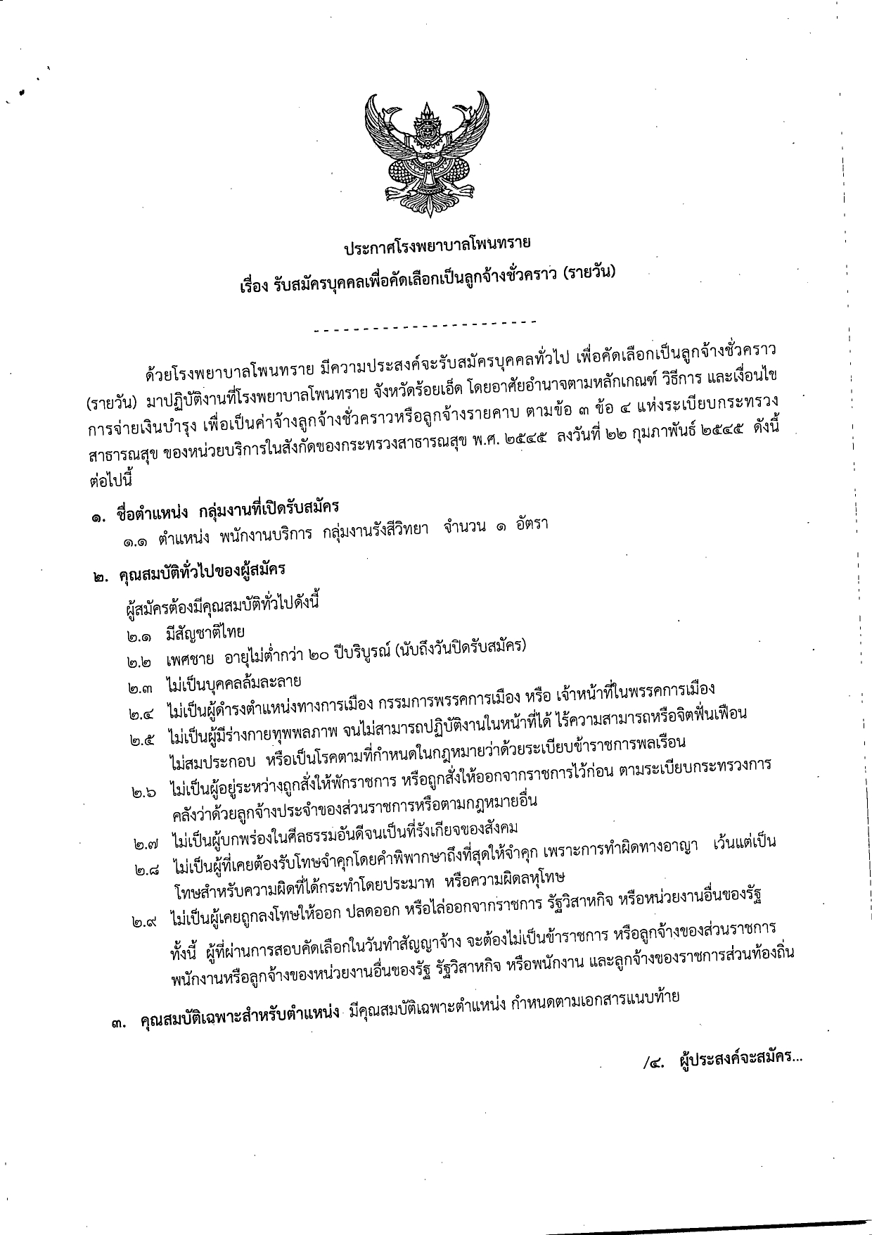 โรงพยาบาลโพนทราย มีความประสงค์จะรับสมัครบุคคลทั่วไป เพื่อคัดเลือกเป็นลูกจ้างชั่วคราว