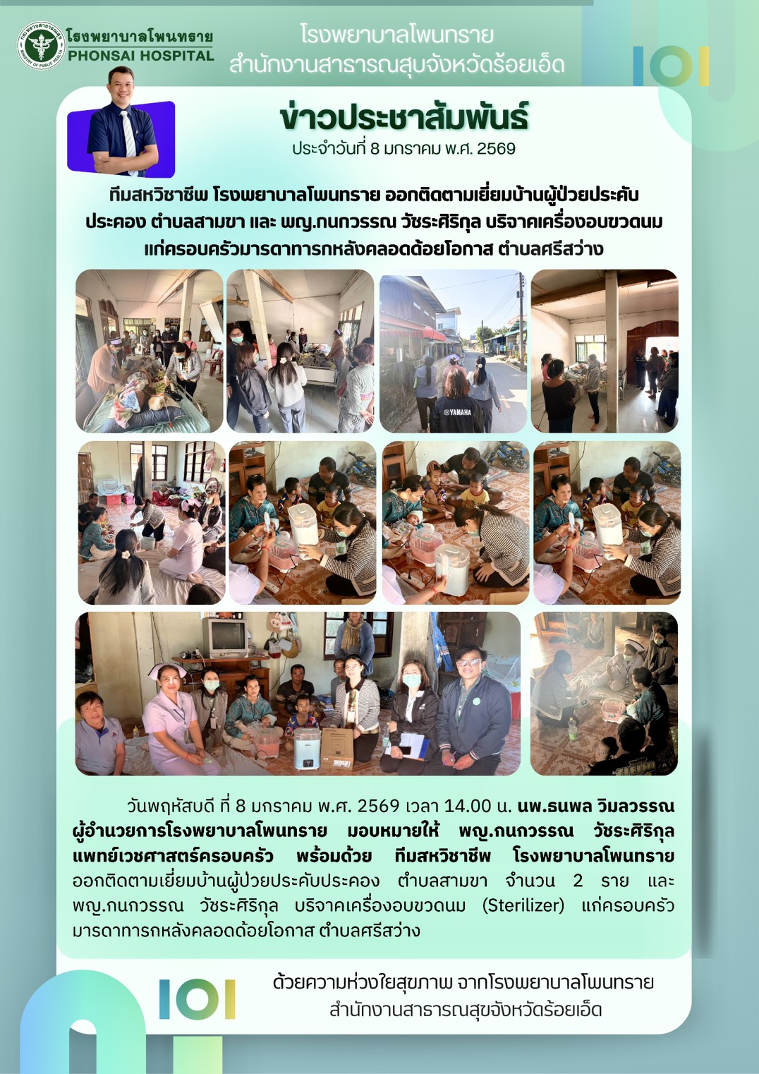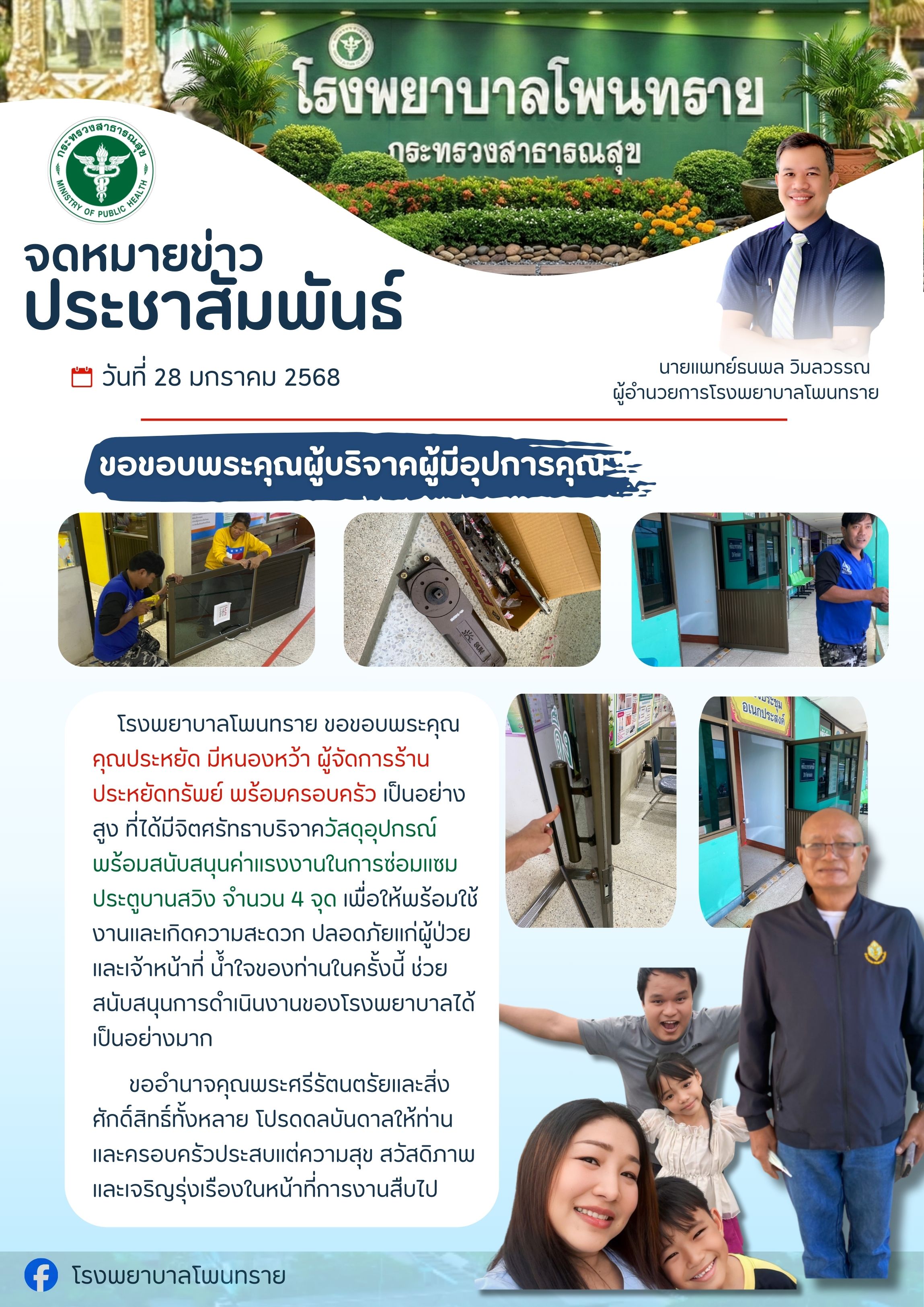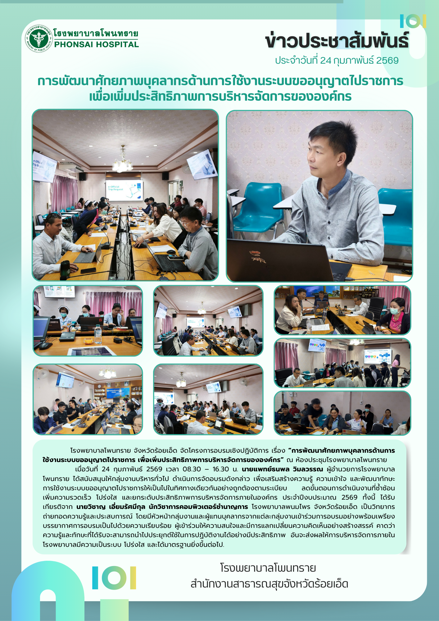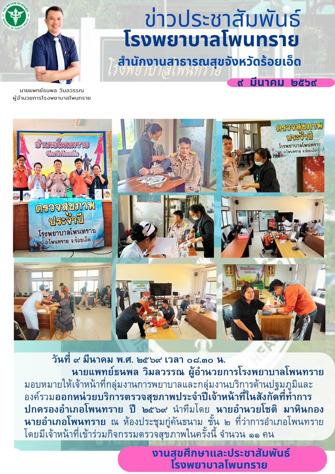 ในวันที่ 4 มิถุนายน 2568 เวลา 08.30 น. ณ ห้องธุรการ กลุ่มงานบริหารทั่วไป ชั้น 2 โรงพยาบาลโพนทราย ตำบลโพนทราย อำเภอโพนทราย จังหวัดร้อยเอ็ด