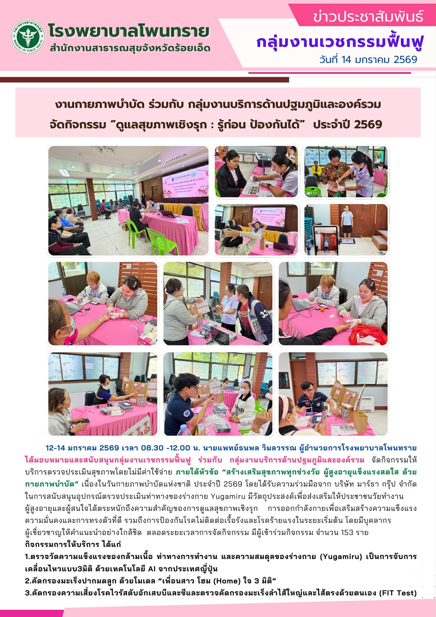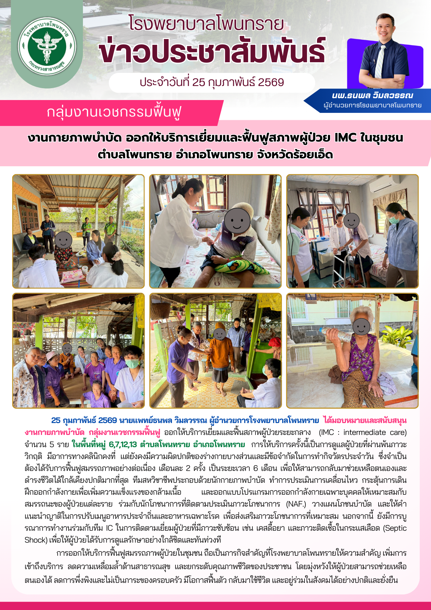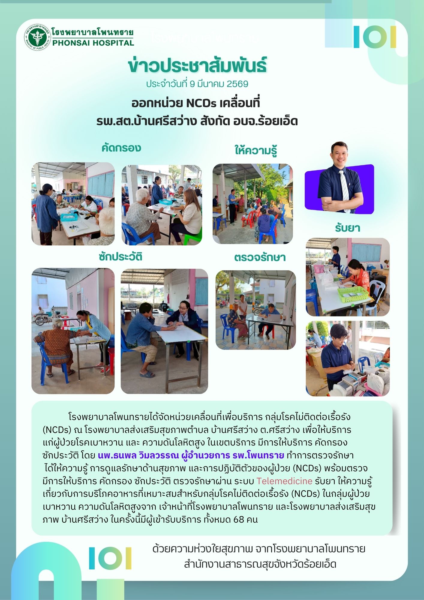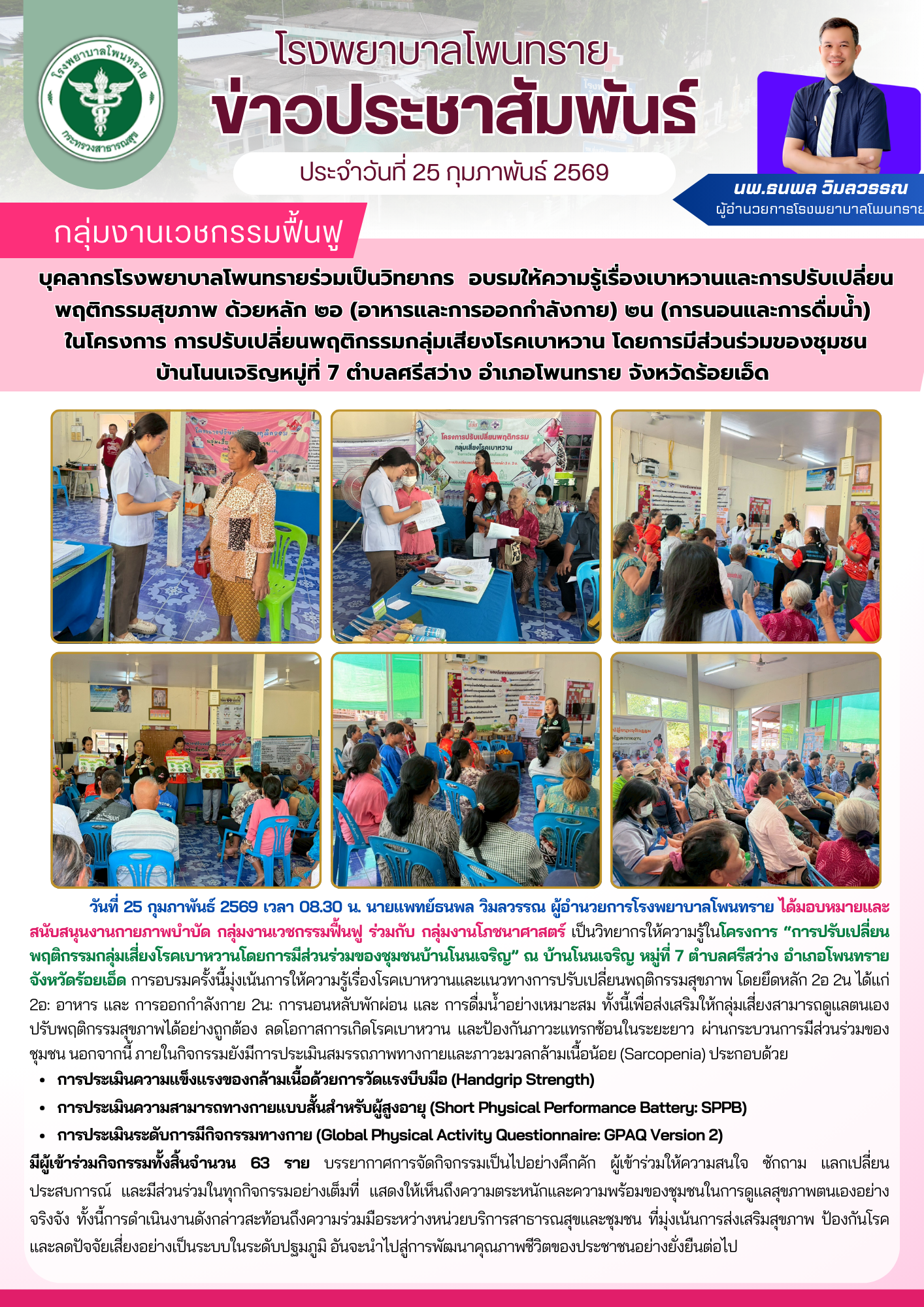 ในวันที่ 4 มิถุนายน 2568 เวลา 08.30 น. ณ ห้องธุรการ กลุ่มงานบริหารทั่วไป ชั้น 2 โรงพยาบาลโพนทราย ตำบลโพนทราย อำเภอโพนทราย จังหวัดร้อยเอ็ด