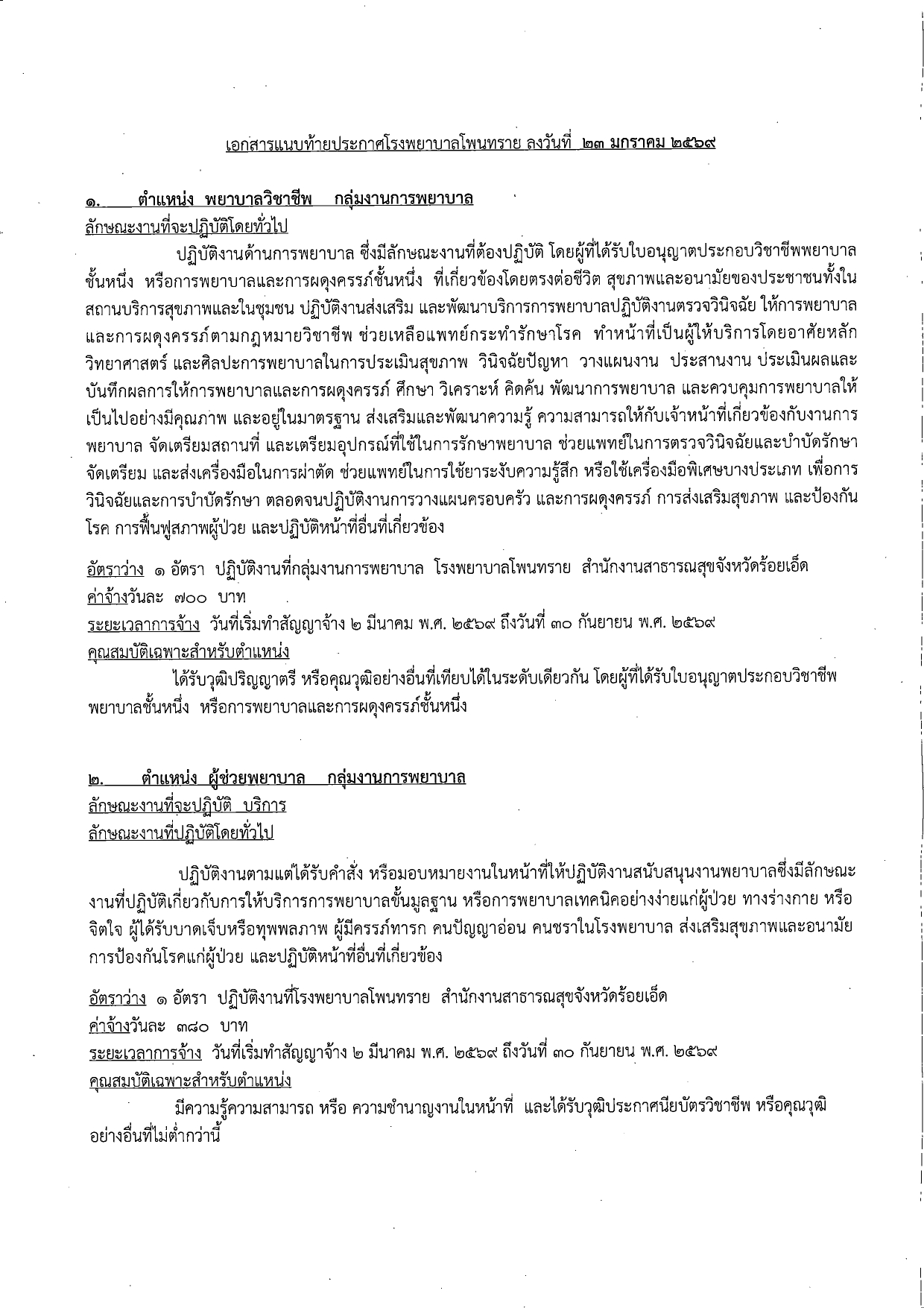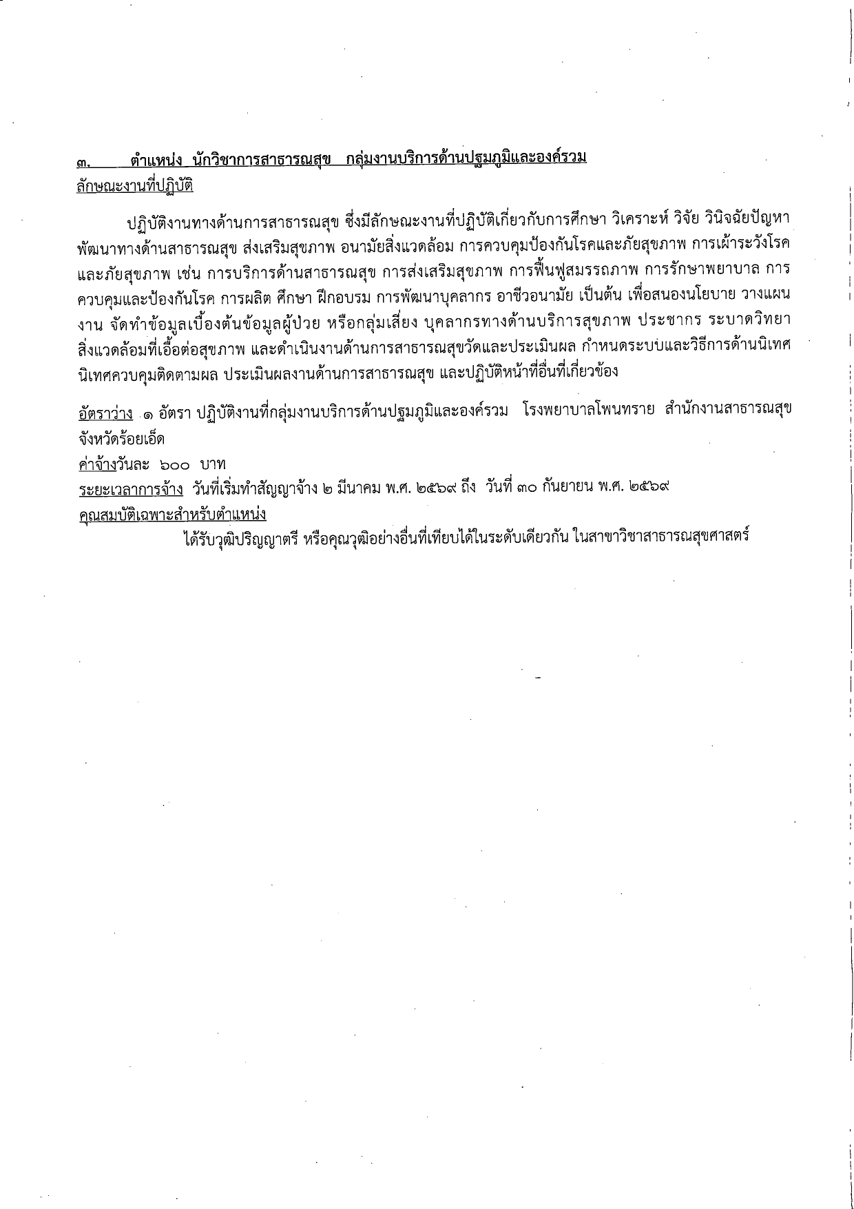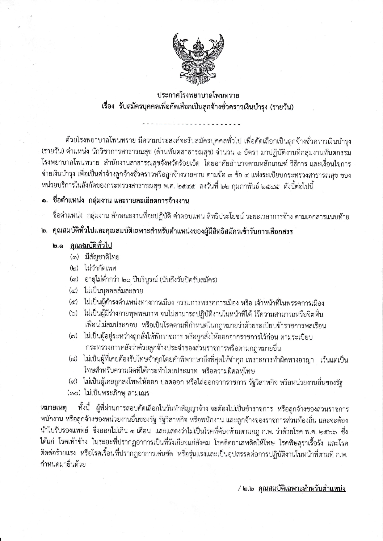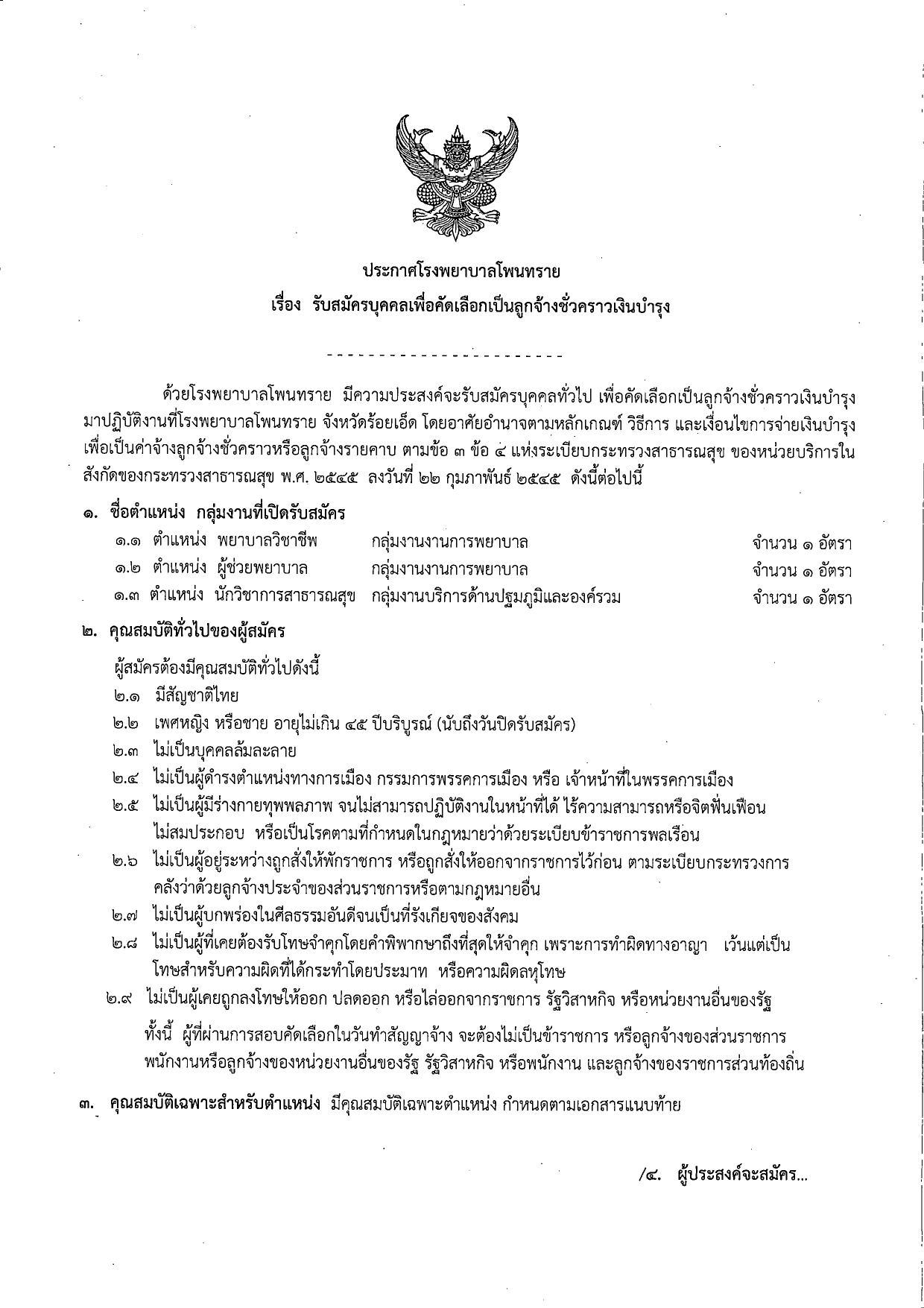 ด้วยโรงพยาบาลโพนทราย มีความประสงค์จะรับสมัครบุคคลทั่วไป เพื่อคัดเลือกเป็นลูกจ้างชั่วคราว(รายวัน) มาปฏิบัติงานที่โรงพยาบาลโพนทราย จังหวัดร้อยเอ็ด โดยอาศัยอำนาจตามหลักเกณฑ์ วิธีการ และเงื่อนไขการจ่ายเงินบำรุง เพื่อเป็นค่าจ้างลูกจ้างชั่วคราวหรือลูกจ้างรายคาบ ตามข้อ 3 ข้อ 4 แห่งระเบียบกระทรวงสาธารณสุข ของหน่วยบริการในสังกัดของกระทรวงสาธารณสุข ดังต่อไปนี้