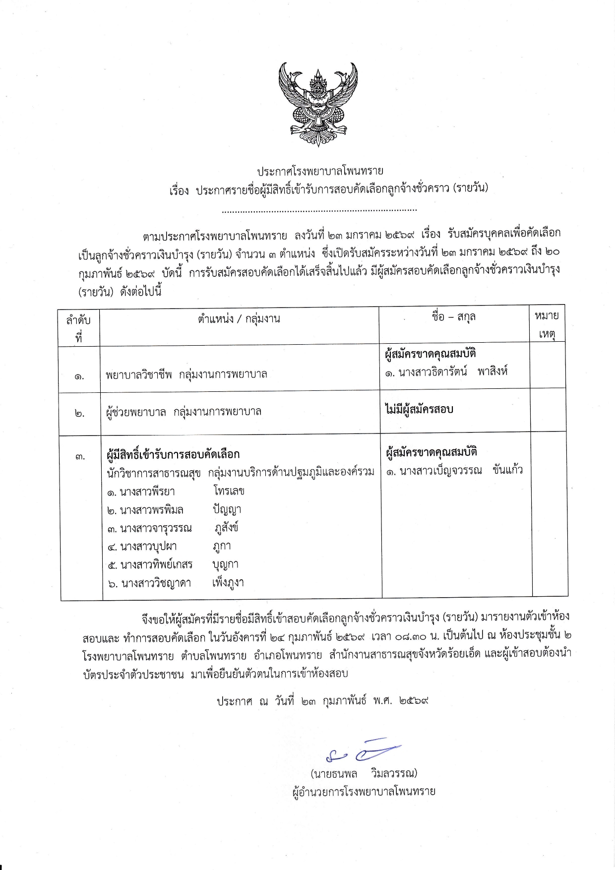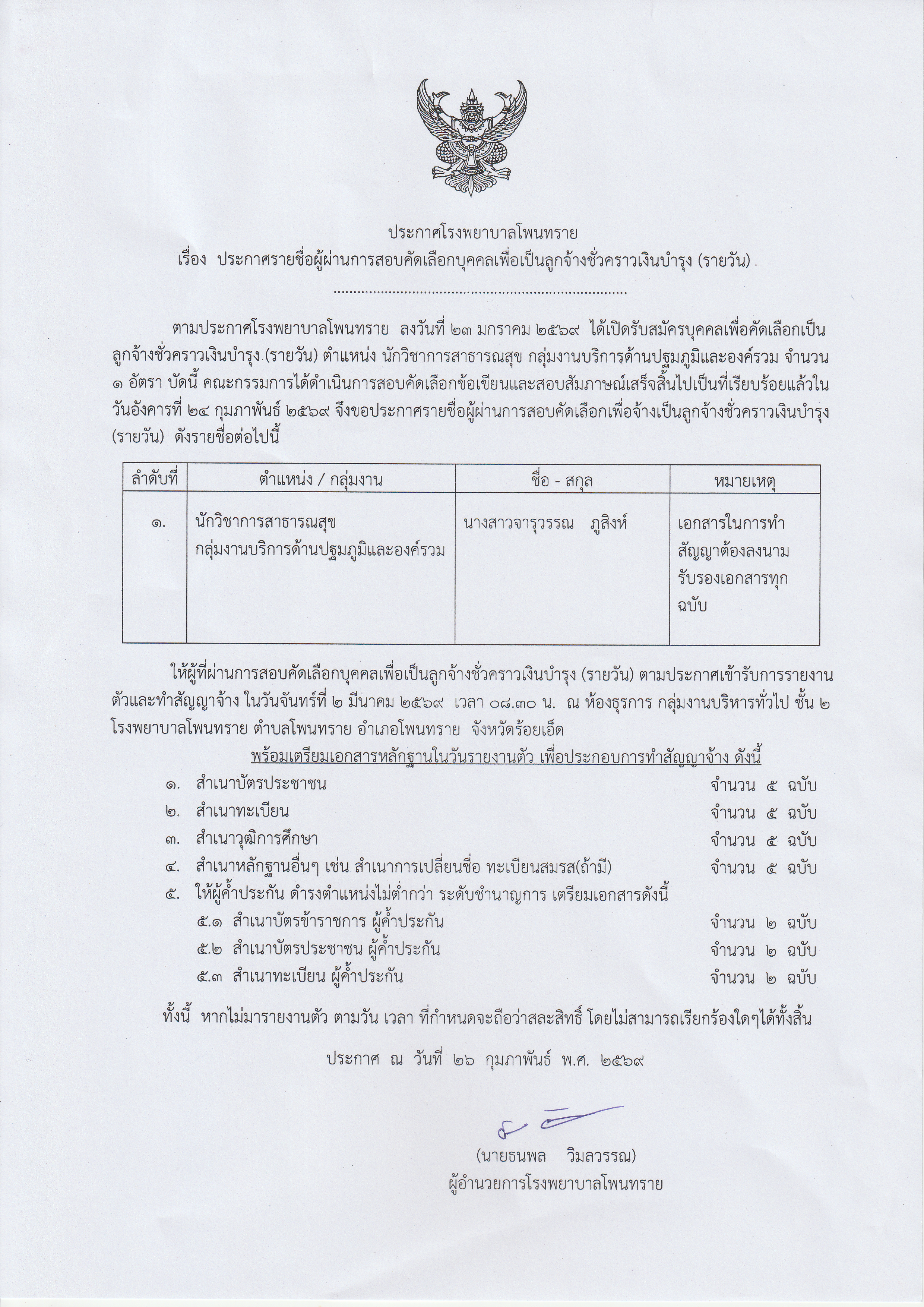 บัดนี้การสอบข้อเขียนและสอบสัมภาษณ์ได้เสร็จสิ้นเรียบร้อย จึงขอให้ผู้มีรายชื่อดังต่อไปนี้ เข้ารับการรายงานตัวและทำสัญญา