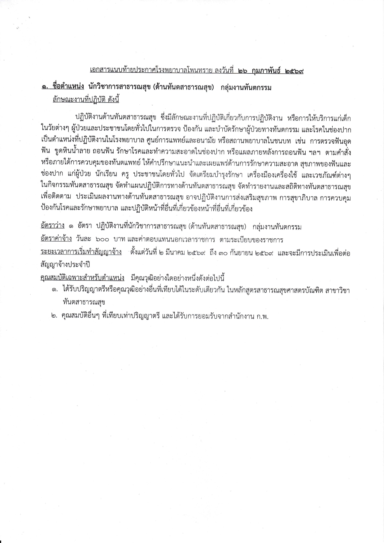 ตำแหน่ง นักวิชาการสาธารณสุข(ด้านทันตสาธารณสุข) กลุ่มงานทันตกรรม จำนวน 2 อัตรา
